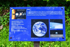 Bei der jeweiligen Umlaufbahn eines Planeten erreicht man die Tafeln mit den jeweiligen Eigenschaften des Himmelskörpers. Die Infotafeln zu den Planeten Merkur, Venus und Erde befinden sich noch innerhalb des Schlossparks, die Tafel zum Mars bereits auf dem Rad-Wanderweg. Diesem Weg folgt man bis zum Ende des Lehrpfades in Weißenstein.