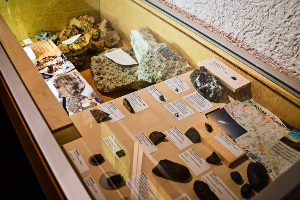 deren Herkunft, Zusammensetzung und Alter in der Vitrine im Eingangsbereich beschrieben wird. Hierin befinden sich Meteoriten, unter anderem aus Amerika und Russland sowie Auswurfmaterial aus dem Nördlinger Ries.